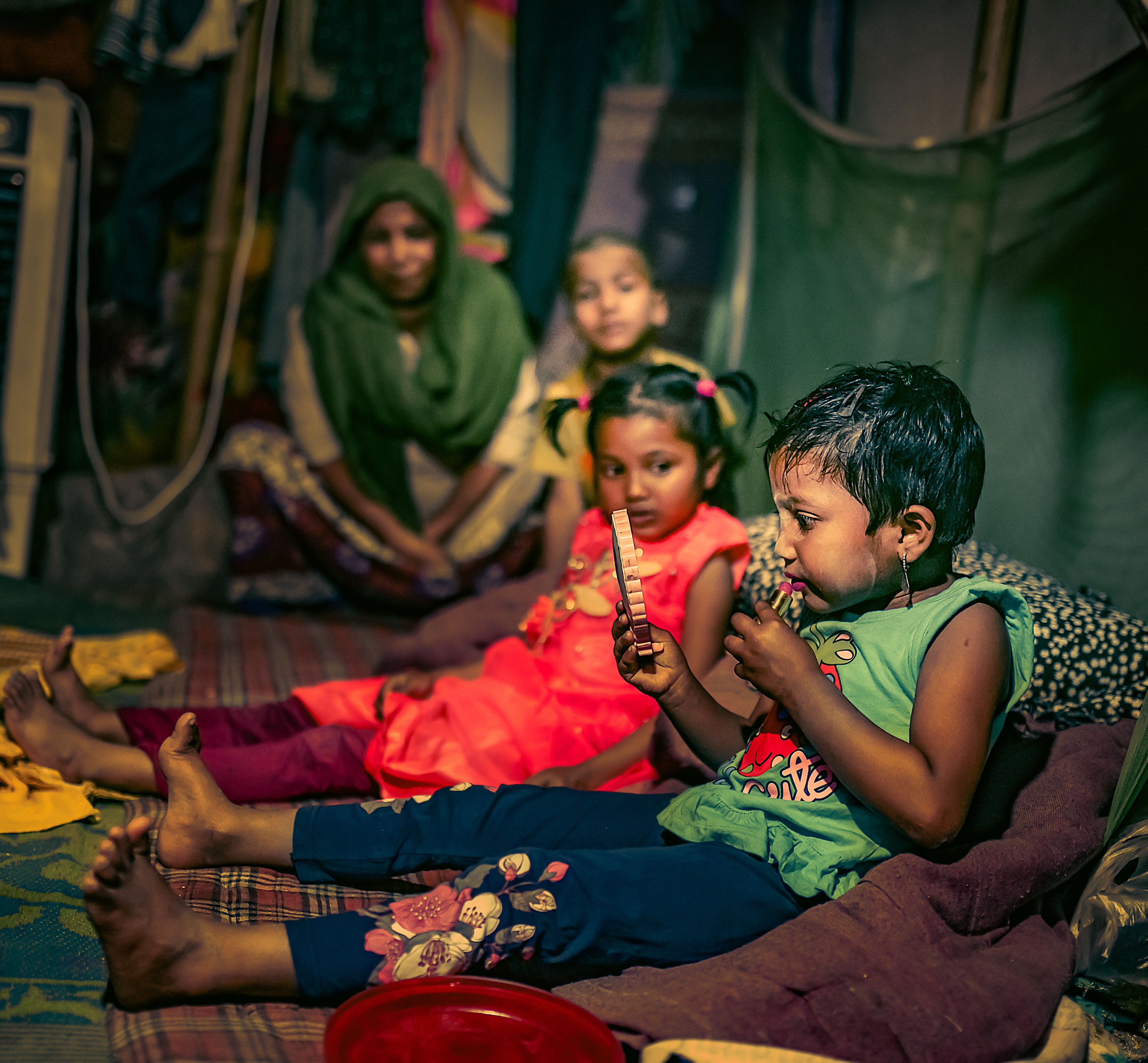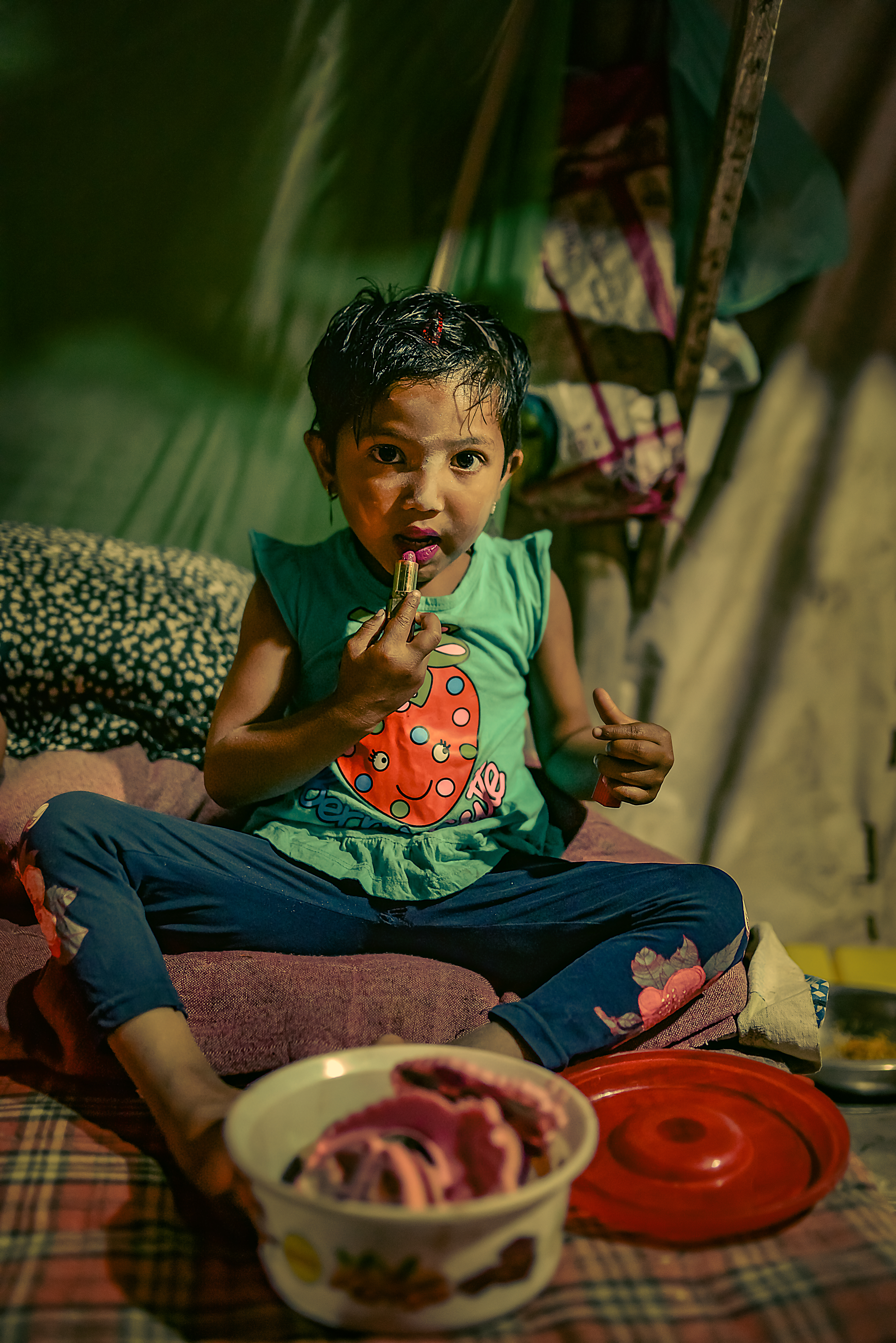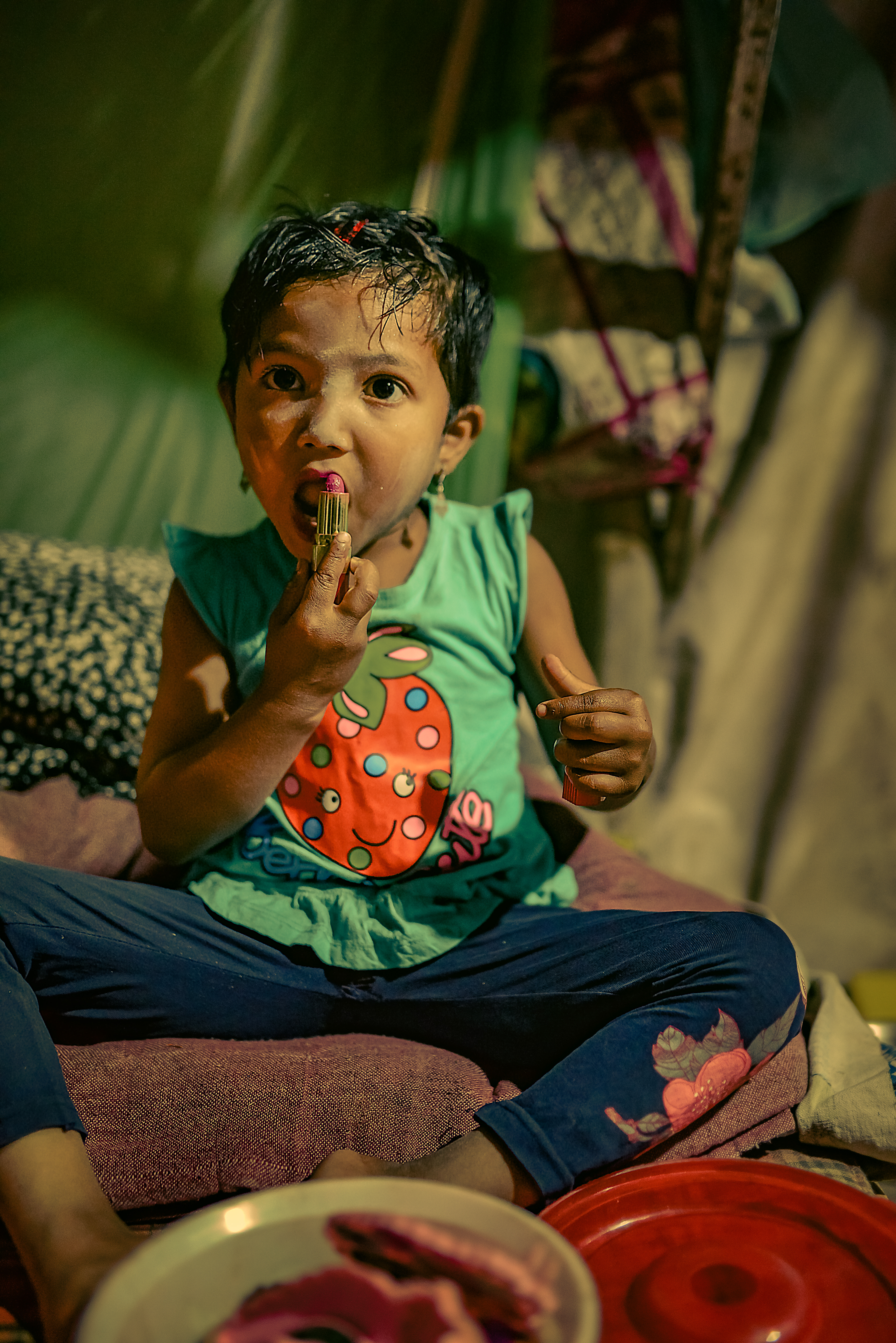 “Ronak”. Her name literally translates to radiance or celebration. She is 3. No. Maybe she is 5. Her mother couldn’t decide what her exact age is. When life is such a strife, you just get on with it. You don’t celebrate occasions. But somehow amidst all of this endless struggle, Ronak knew how to celebrate herself. She had a little box of embellishments. When I went into that choking little, blindingly dark and cluttered space in which she lives with her three other siblings and parents, she quickly took out her “makeup” and started to paint her beautiful face. No care in the world. Unfazed. Just sheer innocence. A magical childhood in the heart of a raging turmoil.